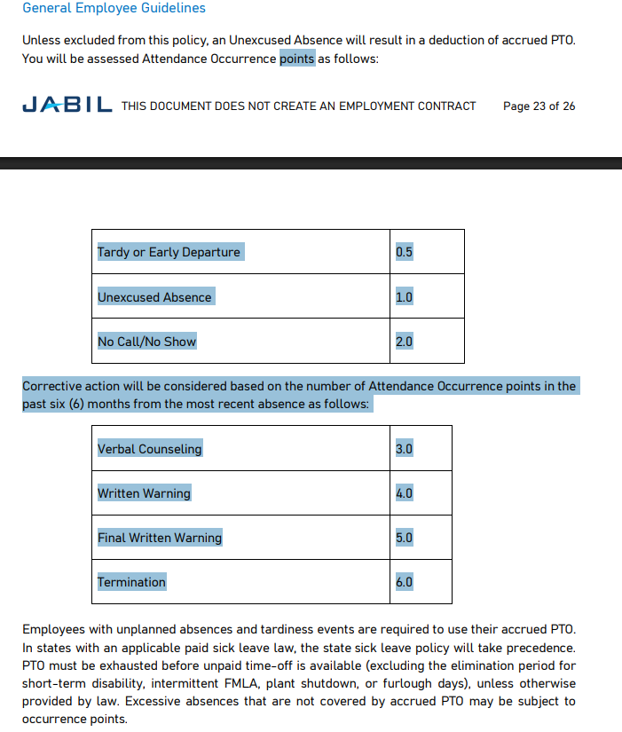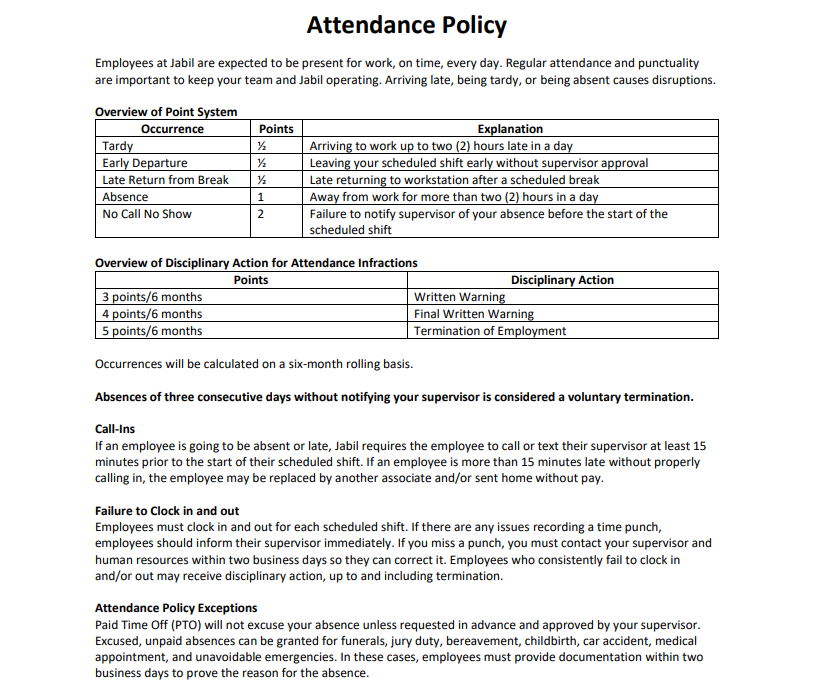 Punctuality and reliable attendance are important to your success on this assignment. Here's an overview of the attendance policy while you're on assignment for Jabil.